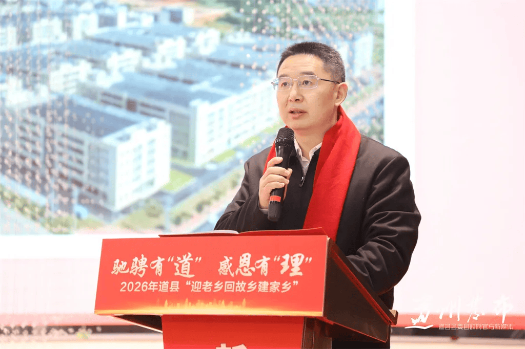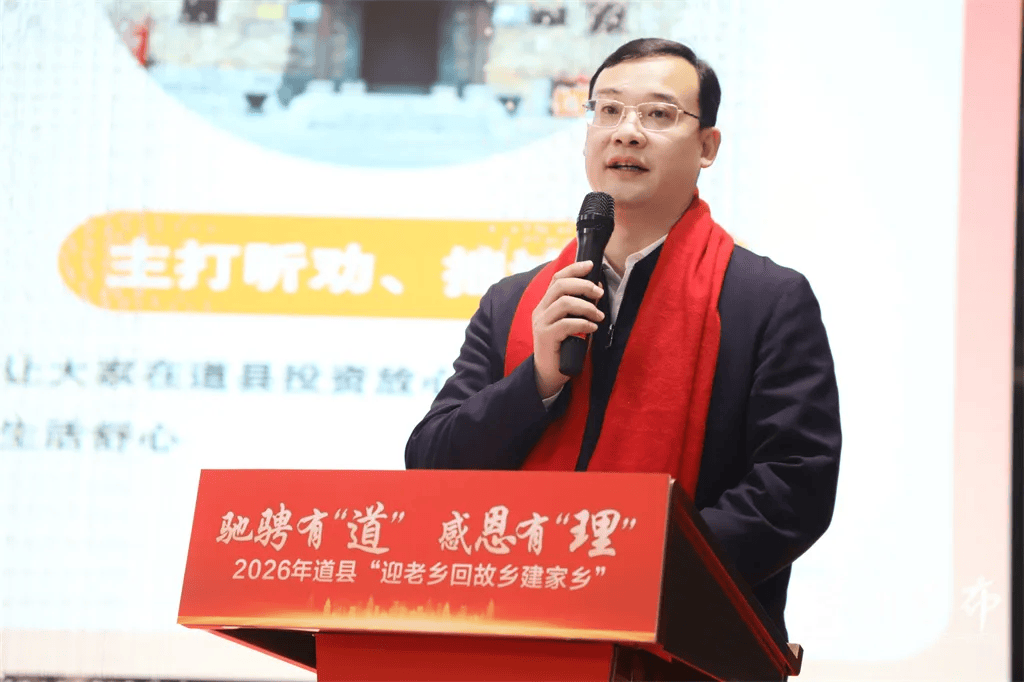 2月20日,道县召开2026年“驰骋有‘道’·感恩有‘理’——迎老乡回故乡建家乡”新春恳谈会,诚邀院士专家、商会代表、企业代表、江苏来宾及各界友人齐聚一堂,共贺新春、共话发展、共谋未来。县委书记唐超学致辞,县委副书记、县长刘华中作招商推介,县委副书记、统战部部长张一波主持。中国科学院院士、中国科学院地球化学研究所研究员胡瑞忠,湖南省林科院(中国林科院湖南分院)院长李昌珠,中国林业产业联合会副会长蒋周明等出席。林志刚、刘忠华、周丽、唐泽彦、朱龙、何小白、陈旺胜、刘飞轮、黄金翠、乌翔宇、何圣志等县领导参加。